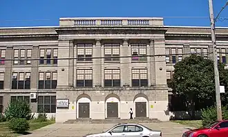 Designed by Irwin T. Catharine and built between 1923 and 1925 at a cost of just over $1 million, this historic structure is a three-story, seventeen-bay-wide and twelve-bay-deep, brick-and-limestone building that was created in the Colonial Revival style. It features a projecting center entrance pavilion with arched openings, stone cornice, and balustraded parapet.[2] The school was named after former President Warren G. Harding.