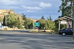 SR 142 begins at an intersection with SR 14 in the town of Lyle, located on the north bank of the Columbia River. The highway travels along the west side of Lyle, following the Klickitat River upstream as it passes through the Mud Spring Canyon, and passes Klickitat County Park. The two-lane, high-speed road is also paralleled to the west by the Klickitat Trail, a multi-use path for bicycles and pedestrians that uses an abandoned railroad grade.[2] SR 142 continues to traverse several canyons, making several bends to the east and north to follow the course of the Klickitat River. The highway crosses over the river near Wheeler Canyon and continues along its west bank to the town of Klickitat, where it serves as the main street.[3]