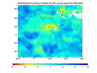 Studies predict that by the year 2050 the rainfall in Sub-Saharan Africa could drop by 10%, which will cause a major water shortage. This 10% decrease in precipitation would reduce drainage by 17% and the regions which are receiving 500–600 mm/year rainfall will experience a reduction by 50–30% respectively in the surface drainage.[32] Additionally, the Human Development Report predicts warming paired with 10% less rainfall in interior regions of Africa, which will be amplified by water loss due to water loss increase from rising temperature.[22] Droughts and floods are considered to be the most dangerous threat to physical water scarcity.[33] This warming will be greatest over the semi-arid regions of the Sahara, along the Sahel, and interior areas of southern Africa.[22]