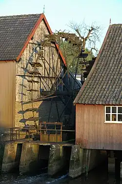The buildings are made of painted wood on a brick foundation, with tiled roofs, and an extruding hatch covering the main entrance of the higher building.[5] The gristmill, originally used to grind spelt, later ground bread wheat, and then a sawmill was added. It has a water wheel of 9.30 metres (30 ft 6 in) in diameter, consisting of 44 paddles of 80 centimetres (2 ft 7 in) width, which makes it the largest water wheel in the Netherlands.[6] The gristmill is still in functioning order, and uses a pair of Cullen millstones from Mayen ("Cullen" for "Cologne", where such millstones were marketed from[7]), and a pair of cast millstones, both 17 hands in diameter or 1.50 metres (4 ft 11 in). Only some remainders are left of the sawmill, including one of only two watermill circular saws in the Netherlands.[1][2] Inside the larger mill is a room for the assistants of the miller, where the names of millers and their assistants have been carved in the wood.[4]