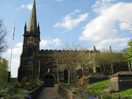The substantial remains of a large ditch excavated in St Mary's Road in 2008, following the contours of the hill and predating the Early Medieval period, has been interpreted as part of a hilltop enclosure and possibly the Iron Age hillfort long suspected on the site.[3] The first authenticated spelling of the name was Wodensbyri, written in an endorsement on the back of the copy of the will of Wulfric Spot, dated 1004. Wednesbury ("Woden's borough")[4] is one of a number of places in England to be named after the pre-Christian deity Woden, the leader of the Old English pantheon.