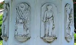The fountain is built in Neoclassical style with basalt. It has two tiers and the lower tier has eight bas reliefs depicting the duke's victories. The top tier is made out of metal and features cast iron leaves. There are Latin inscriptions on the fountain that celebrate the achievements of the duke.[3]