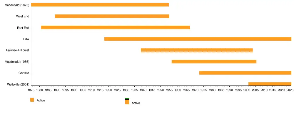 | Central High School | Wellsville High School MacDonald School | 1875 | 1954 | Demolished Current site of MacDonald Elementary (1955) |