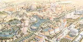 In 1991, Disney announced plans to build WestCOT on the site of the Disneyland parking lot.[1] It was themed around a utopian vision of the future, similar to EPCOT Center at Walt Disney World, and it was planned to be the first Disney theme park to contain hotels within the park.