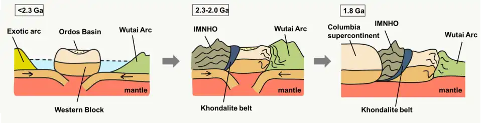 In Kusky et al.'s model,[5][40] ancient continental blocks formed the juvenile Western Block during 3.5-2.7 billion years ago. Prior to 2.3 billion years ago, Wutai Arc was subducted under the eastern part of the juvenile Western Block, while an exotic arc was subducted under the eastern juvenile Western Block. Between 2.3-2.0 billion year ago, the Western Block collided with the two arc on its both sides, creating Hengshan granulite belt in the southeast and Inner Mongolia-Northern Hebei Orogen with khondalite belt inside in the northwest. Finally, supercontinent Columbia collided in the northern margin of the North China Craton at 1.8 billion years ago.