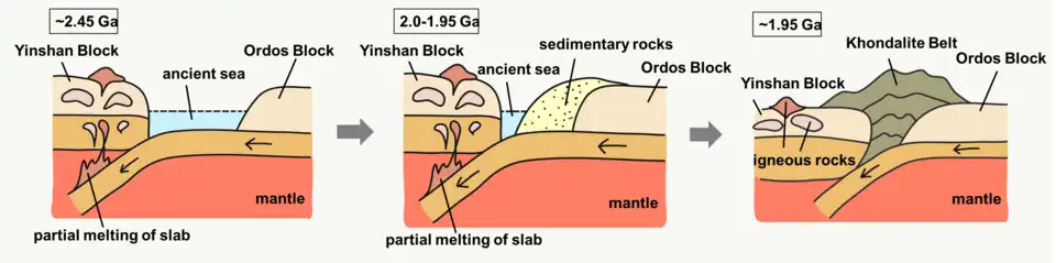 Zhao et al.'s model[1][3][4] can be divided into two major stages: Neoarchean crustal accretion and Paleoproterozoic amalgamation of the two sub-blocks (Yinshan Block and Orods Block). Zhao and other researchers proposed that there was a major crustal accretion of the juvenile Yinshan Block at about 2.7 billion years ago, forming a thick mafic crust, although it is still uncertain whether the magmatic event occurred in a continental or an oceanic setting. During 2.55-2.50 billion years ago, the juvenile Yinshan Block was partially melted to produce enormous amounts of TTG rocks, covering the whole Yinshan Block. At about 2.45 billion years ago, Ordos Block was subducted beneath the Yinshan Block. The partial melting of the subducting slab formed granites and volcanic rocks like adakites and sanukitoids. Between 2.0-1.95 billion year ago, sedimentary rocks deposited on the stable passive margins of continent in the northern Ordos Block. The final assembly of the Western Block took place at approximately 1.95 billion years ago. The ancient ocean closed as the continents of southern Yinshan Block and northern Ordos Block collided. The high pressure and temperature of continent-continent collision formed Khondalite Belt in-between the two sub-blocks and led to metamorphism in other parts of the Western Block.[1][3][4]