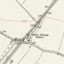 As the first station on the new line, Weston-sub-Edge was opened on 1 August 1904.[6] Initially known as Bretforton and Weston-sub-Edge until 1 May 1907,[6] the station was a mile from Weston-sub-Edge and 3 miles (4.8 km) from Bretforton.[7][8] It was located immediately to the north of the bridge carrying the B4035 road over the line from which a footpath led down to the 'Up' platform.[7] The 400-foot (120 m) platforms were equipped with the usual lamps, nameboards and fencing.[7] A 27-lever signal box was provided on the 'Up' side to the south of the platform and it controlled a siding capable of holding 15 wagons, as well as access to the small goods yard, equipped with a small goods shed, 6-ton crane and weighbridge, which handled mainly agricultural and, in particular, meat for use in the production of animal glue.[9][10][11] Average tonnage handled was around 3,000 tons a year in the 1920s, which began to fall off in the 1930s before picking up again in the Second World War when it reached a peak of 15,366 in 1941.[12] The principal generator of wartime traffic was the airfield established to the north-west of the station behind the signalbox; the airfield was known as Honeybourne and its personnel used the station.[13]