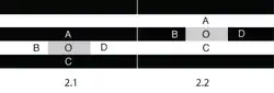 Lateral inhibition cannot explain White's illusion.[1] In Figure 2.1 lateral inhibition sent by black cells A and C should make cell O lighter; in Figure 2.2 lateral inhibition sent by white cells A and C should make cell O darker. It is suggested that brightness induction follows the brightness contrast in the direction of the bar not the surrounding area.