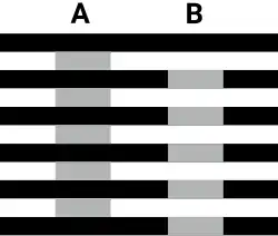 White's illusion is a brightness illusion in which certain stripes of a black-and-white grating are replaced by gray rectangles (see the figure). Both of the gray bars of A and B have the same color, luminance, and opacity. The brightness of the gray rectangles appears to be closer to the brightness of the top and bottom bordering stripes. This is opposite to any explanation based on lateral inhibition; hence it cannot explain the illusion.[1] A similar illusion occurs when the horizontal stripes have different colors; this is known as the Munker–White illusion or the Munker illusion, based on the Bezold effect.[2][3]