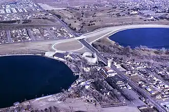 Lakeside Park was built by a group led by Denver brewer Adolph Zang,[2] on an approximately 57-acre site[3] located adjacent to Lake Rhoda (then known as West Berkeley Lake).[4] Originally known as “Lakeside Park,” “The White City," and "The Coney Island of the West,"[5] the park featured the Beaux-Arts and Neoclassical architectural styles favored in many other Exposition-themed amusement parks of the era, and was lit by an estimated 100,000 electric bulbs.[6] It was serviced by a trolley line built by the Denver Tramway, making it a trolley park; however, unlike most trolley parks, Lakeside was independently owned, and included ample space for automobile parking.[7]