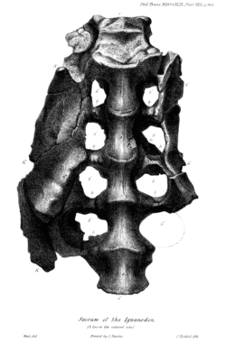 Among Saull's exhibits was the sacrum of Iguanodon, mentioned by Richard Owen in one of his Reports on British Reptile Fossils.[9] This specimen originated in the Isle of Wight, and is now in the Natural History Museum; the significance of the fused vertebrae with it came to Owen after his 1841 BAAS talk in Plymouth. It was a key step in postulating the Dinosauria.[10] In fact Owen reviewed numerous specimens in 1842, of which those held by George Bax Holmes and Saull were the prominent examples in private hands; the sacrum has been called a "major factor" in erecting Dinosauria, and has been regarded as the first true dinosaur specimen.[11]