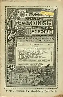 Born in Toronto, Upper Canada, Withrow received his education at Toronto Academy, Victoria College, Cobourg, and University of Toronto, graduating from the latter with the degree of B.A. in 1863. Previous to entering college, he spent three years in the office of architect William Hay of Toronto. He was ordained at Hamilton in 1864, and served the church at Waterford, Montreal, Hamilton, Toronto, Niagara, and Hamilton a second time. He was originally connected with the New Connexion Methodist body, but joined the Wesleyan Conference in 1867, and was an ardent advocate of union. In 1874 he became editor of the Canadian Methodist Magazine and Sunday School periodicals, retaining that role until 1906.[2]