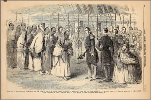 The Japanese reached Aspinwall and boarded the Roanoke 25 April 1860. Commodore McCluney greeted the delegation with full honors and entertained the principal ambassadors, Shinmi Masaoki (新見正興), Muragaki Norimasa (村垣範正), and Oguri Tadamasa (小栗忠順) as Perry had in 1854 when McCluney commanded the Powhatan.[53] Ambassadors, embassy staff, and servants numbered more than seventy and were accommodated in special quarters McCluney had erected on deck.[54] The Roanoke departed 26 April and arrived in 13-days off Sandy Hook for New York.