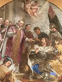 During St. Bernard's time spent with William, he invited him to attend mass at the La Couldre church. During communion, Bernard went to the door with the Eucharist on the sacred paten and pointed the Host toward him and asked him not to look at God as he did his servants.[6]