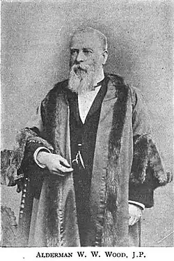 William Willis Wood[1][2][3] was born in Bradford in 1832. He attended Bradford Moor Sunday and Day School to the age of 11 when he started work in a local factory. He undertook further studies at the Bradford Mechanics' Institute. He continued to champion access to education throughout his life, supporting the Old Bradford Sunday School and serving as a secretary of the Mechanics institute. He became a co-owner of Junction Mills (worsted spinner) at Laisterdyke.[4] Wood was elected councillor for Bradford Moor Ward in 1877 and served until November 1883. In 1883 he was elected alderman and served until November 1907. In November 1894, he was elected Mayor of Bradford and served until November 1896. Wood represented Bradford City Council on the Board of Bradford Grammar School. He resided at Greenhill House on Leeds Road in Bradford in what is now Saint Peter's Presbytery.[5][6] He died in 1905 and is buried in Bowling Cemetery in Bradford.[7] Wood Was succeeded in office by Thomas Speight (1844–1921), who was Mayor of Bradford from 1896 to 1898.
