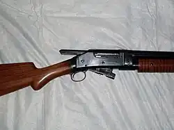 The Winchester Model 1897 and the Winchester Model 1893 were both designed by John Browning. The Model 1897 is an external hammer shotgun that is lacking a trigger disconnector. This means that the user can hold the trigger down while cycling the shotgun and once the action is returned to battery the shotgun fires.[12] The firearm itself is classified as a slide action pump shotgun. It was the first truly successful pump-action shotgun produced. Throughout the time period the Model 1897 was in production, over a million of the type were produced in various grades and barrel lengths. 16-gauge guns had a standard barrel length of 28 in (71 cm), while 12-gauge guns were furnished with 30 in (76 cm) length barrels. Special length barrels could be ordered in lengths as short as 20 in (51 cm), and as long as 36 in (91 cm). Along with various grades and barrel lengths, the Model 1897 came in two different chamberings. One was the 12 gauge and the other was the 16 gauge.[12] The shells should be of the 2+58 inch or 2+34 inch models.[7] Any shells larger are not recommended. An average Model 1897 can hold 5 or 6 shotgun shells in the magazine tube.[13] When working the action of the Model 1897 the forend (fore grip) is pulled back, forcing the breech bolt to the rear which extracts and then ejects the spent shell while simultaneously cocking the external hammer by pushing it to the rear. When the forend is slid forward again, the breech bolt pushes a fresh shell into the gun's chamber and locks into place.
