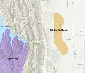 Winters Highlands is an American Viticultural Area (AVA) located in portions of Solano and Yolo Counties, California. It is located in the easternmost foothills of the northern Coast Range, where the Coast Range adjoins the Sacramento Valley which is a segment of the vast California Central Valley. The AVA was established on August 29, 2023 by the Alcohol and Tobacco Tax and Trade Bureau (TTB), Treasury after reviewing the petition submitted on behalf of Berryessa Gap Vineyards proposing a viticultural area named "Winters Highlands." The elongated Winters Highlands, on a north-south axis, encompasses approximately 7,296 acres (11.4 sq mi) where its eastern boundary is adjacent to the city of Winters and is isolated from any other AVA. There are planted vineyards covering approximately 134 acres (54 ha) in the viticultural area with three wineries. According to the petition, an additional 60 acres (24 ha) are planned for cultivation in the next few years. The distinguishing features of Winters Highlands are its climate, specifically, its temperature, precipitation, relative air humidity, and its soils. Grape varietals grown in the AVA include Petite Syrah, Tempranillo, Malbec, and Chardonnay.[1][7]