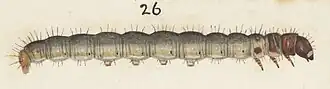 Adult porina moths mate as soon as they emerge from the soil after completing the larval stage.[4] The moths fly in spring, summer, and early autumn depending on location.[4] The moths do not feed and only live a few days. During these few days, the female moth flies over pastures and releases around 3000 eggs. Her eggs will hatch within a few weeks.[4] At first the newly hatched caterpillars will live above ground. They spend about 5 weeks on top of the soil feeding on plant matter and microflora.[4] As the caterpillars grow larger, they burrow beneath the soil and construct permanent silk burrows which can reach a depth of around 30 cm.[7] They will emerge from these burrows at night to feed. They sever grass and clover leaves at the base of the plant and drag them back to their burrow to consume.[4] Porina caterpillars will moult seven or eight times over their lifetime. Development from egg to adult takes 12 months.[4]