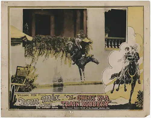 Tony is most known for his intelligence and ability to perform remarkable stunts, many of which would not be allowed today due to the danger involved. Tony performed in the years before the American Humane Association oversaw the use of animals on American productions. Since animals cannot verbalize agreement to be actors, the American Humane Association began to oversee how animal labor was created, filmed, and commercialized in 1940, eight years after Tony's retirement.[12] Tony was a naturally gaited Tennessee Pacer or Walking horse. He received his initial breaking and gait training from Kentucky trainer Tom Brinley. A later owner, Pat Chrisman, further trained him for tricks and stunts, then sold him to Tom Mix. Mix reportedly did not have to train Tony, but simply show him what to do for each feat. Mix could convey any sort of message to the pony by touches of the hand or fingers on Tony's neck, although speculation existed that whips, strong bits, and spurs were used. Such stunts included untying Mix’s hands, opening gates, jumping over high fences, getting tangled in ropes, loosening his reins, rescuing Mix from fire, jumping from one cliff to another, and running after trains.[13][14] In the 1926 film The Great K & A Train Robbery (Fox Film Corporation), Mix jumps Tony through a glass window into a building and rides him alongside a speeding train. In the film Trailin' (1921) Mix and Tony have a bridge slashed from under them, and uncut footage shows the pair tipping over to the river below.[15]