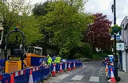 In the foreground are a group of ragged children who have recently suffered a bereavement, evidenced by the black band on the baby's arm. As Brown says in his description, their ragamuffin status suggests that it was their mother who died. The oldest child, wearing borrowed clothing too old for her, tries to control her wayward brother, who is playing with the navvies' wheelbarrow. The younger girl sucks a carrot in lieu of a dummy and looks into the hole created by the workers. Their mongrel pet dog challenges the fashionable lady's pet dog, because, writes Brown, he hates "minions of aristocracy in jackets". The baby, who looks challengingly out at the viewer, occupies a central position in the composition. Brown's description emphasises this challenge by suddenly moving from a first-person narrative to the second person – speaking to his fictional fashionable lady about the perilous situation of the impoverished children.[6]