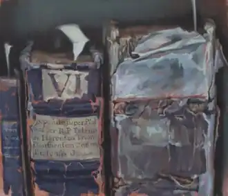 In 1993, Xie began painting library books, intrigued by the architectural quality of rows and stacks and by their conceptual potential as material carriers of ideology, cultural memory and history.[31][32] He has explored this theme in many forms (decaying Chinese manuscripts, venerable reference books, crisp art archives, musical scores) found in libraries and museums from around the world.[31][20][26][8][33] The "Library" paintings take up concepts including order and control (through systems of classification), the potential for disorder, decay, and the vulnerability and fragmentary nature of historical memory; Xie has suggested that his horror at the historical destruction of books by China's Red Guards during the Cultural Revolution, in part, played a role in his chosen themes.[20][21][33]