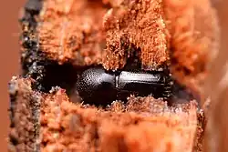 The females excavate galleries consisting of entrance tunnels, brood chambers containing eggs and immature beetles, and branch tunnels where the young develop. These galleries are commonly found at the base of the trunk and can house dozens of beetles. This arrangement accommodates all life stages and developmental processes in the insect's life cycle. The larvae go through three instars, and the complete development from the egg to the adult stage takes approximately 30 days.[10]