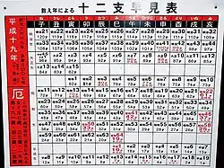 Different historical sources specify different ages as yakudoshi. For example, the Iroha Jiruishō (色葉字類抄), a Japanese dictionary from the Heian period (12th century), states that the years 13, 25, 37, 49, 61, 73, 85, 97 are unlucky.[3] On the other hand, the Shuugaishou (拾芥抄), from the Kamakura period, states that 13, 25, 37, 49, 61, 73, and 99 are yakudoshi.[4] The 16th-century source Kanei (寛永) states that 13, 25, 37, 49, 61, 85, and 99 are the yakudoshi numbers.[5] And in Buddhist teachings, meanwhile, 7, 13, 33, 37, 42, 49, 52, 61, 73, 85, 97, and 105 are considered to be unlucky.[3]