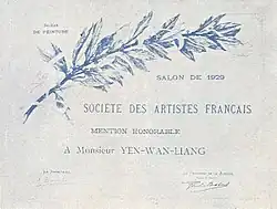 An Honourable Mention certificate Yan Wenliang received during his Paris years at the Salon de 1929
