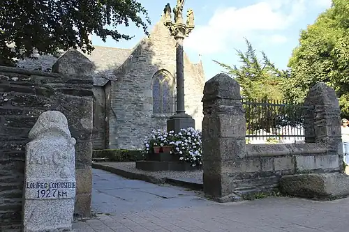 Larhantec executed this Calvary in 1866. It is known as "La croix de Traon-Meur" and is 7 metres in height. A plaque makes reference to the mission of 1866. The calvary is located in the cemetery.[14][15][16][17]