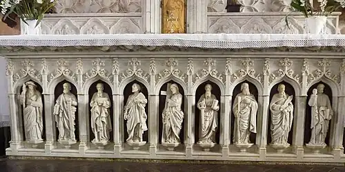 Larhantec executed statues in white marble for the altar of this Plougonven church in 1866.[3]
