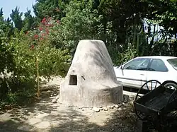 Between 1850 and 1855, Palomares built a new home, which is the present historic site.[4] The 13-room adobe was built in a T-shape with a courtyard. The living room and master bedroom were located at the stem of the T, and the adobe also had four more bedrooms, a dining room, kitchen, storeroom, tienda (or store), and storage chambers.[2][4] The kitchen was located at the north end of the T, close to the outdoor oven (or "horno").[5] The house has been said to represent the blending of Mexican adobe construction and American styles, with the use of wood-shake roofing and milled-wood flooring on the adobe structure.[4]