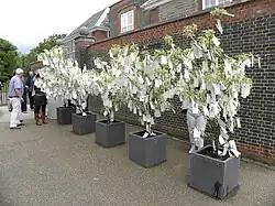 Ono returned to Liverpool for the 2008 Liverpool Biennial, where she unveiled Sky Ladders in the ruins of Church of St Luke (which was largely destroyed during World War II and now stands roofless as a memorial to those killed in the Liverpool Blitz).[129] Two years later, on March 31, 2009, she went to the inauguration of the exhibition "Imagine: The Peace Ballad of John & Yoko" to mark the 40th anniversary of the Lennon-Ono Bed-In at the Queen Elizabeth Hotel in Montreal, Canada, from May 26 to June 2, 1969. The hotel had been doing steady business with the room they stayed in for over 40 years.[130] That year Ono became a grandmother when Emi was born to her daughter Kyoko.[131]