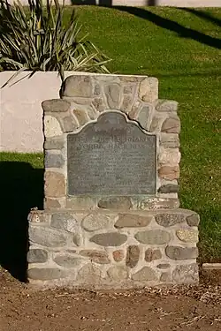 The site of the hacienda is registered by the state as California Historical Landmark #226.[1] A stone marker, placed by the California Centennials Commission and dedicated 3 May 1950, has a bronze plaque titled "Site of Don Bernardo Yorba Hacienda" which gives a brief summary of the historical background of the site. The marker faces south and is located on the northeast corner of Esperanza Road and Echo Hill Lane in Yorba Linda, at the entrance to the Fairmont Hill community. According to the plaque, the base was furnished by the Placentia Round Table Club and supposedly contains some of the original adobe bricks from the hacienda structure[15] salvaged from the barranca where it was dumped. There are a few red bricks found on the backside, but most of the base seems to be made of large stones cemented together. The site marker is actually 55 yards northeast from the east wall of the original main structure. Based on survey reports registered with the county, the true site of this structure is parallel with the road in what is now the westbound fast lane of Esperanza road on the north side of the center divider, midway along the left turn lane opposite Echo Hill Lane.[16]