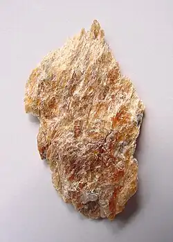 The mineral is brownish pink, rose pink or yellowish in color, with a silky to vitreous luster and a nearly white streak. It occurs in semi-transparent fibrous, scaly or lamellar aggregates up to 10 cm across.[2]