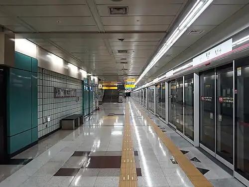 Yulha Station (Korean: 율하역; Hanja: 栗下驛; RR: Yulha-yeok) is a station of Daegu Subway Line 1 in Yulha-dong, Dong District, Daegu, South Korea. Two exits were established in 2010. Beomanno Road is to the south. Apartments in the neighborhood were built by new city development.