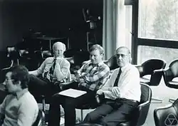 ![]() Gérard Debreu, Yves Balasko and Edmond Malinvaud at Oberwolfach, circa 1977 | |