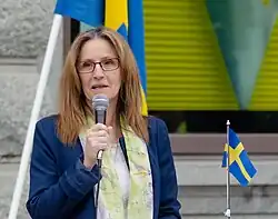 ![]() Yvonne Lindholm speaking at Alternative for Sweden's meeting on Mynttorget in Stockholm on 9 August 2022 | |