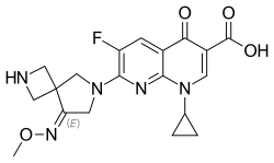 | Preferred IUPAC name 1-Cyclopropyl-6-fluoro-7-[(8E)-8-(methoxyimino)-2,6-diazaspiro[3.4]octan-6-yl]-4-oxo-1,4-dihydro-1,8-naphthyridine-3-carboxylic acid | |