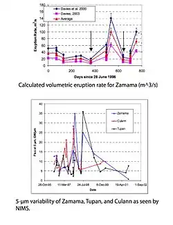 - Average volumetric rates decreased at the beginning of the period, which indicates a lessening in diffusive activity, or cooling of old flow surface. Later, there was an increase in volcanic activity, indicating the beginning of an eruption.