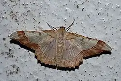 Palpi short, porrect (extending forward) and roughly scaled. Antennae of male ciliated. Hind tibia dilated, with a fold and tuft of long hair on inner side. Forewings highly falcate (sickle shaped) at apex. The outer margin excised from the apex to vein 4, then oblique to outer angle. Vein 3 from angle of cell. Veins 7 to 9 stalked, vein 10 absent and vein 11 free. Hindwings with short and broad cell. Vein 7 and 8 being much arched near base. Vein 3 from angle of cell. The outer margin produced at the vein in male and highly angled at vein 4 in female.[3]