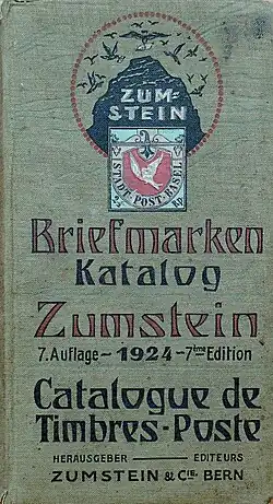 The Zumstein catalog is a postage stamp catalog from Switzerland. It has been issued regularly since 1909 and is considered to be an important reference work of Swiss philately. It is published in German and French languages.