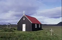 As all the estate farms in Iceland, Krýsuvík had its own small proprietary church, in this case from the 13th century until 2010. The last building was a 19th century timber church built in 1857.[5] The church was then changed into an apartment building for some time after 1927. In 1964, the mayor of Hafnarfjörður had the church renovated and used for weddings and placed under the protection of the National Museum[3] as part of the National Museum’s Buildings Collection.[5] It burned down in January 2010.[3] An association was formed to build a replica, which was done by students and teachers at the technical school in Hafnarfjörður. The replica was driven to the site by truck and unloaded in 2020.[6]