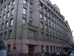 The building is assigned to serve as an office building for the Prague Town Hall.[9] The structural modifications are led by an attempt to loosen up the ground plan, which may be too tight by today's standards, and combine the smallest office areas into larger wholes. On all floors, office space is complemented with the requisite operating background. The ground floor is intended for the interaction between the authority and the general public. The interconnection of both buildings by prolonging the original passage with entrances from Jungmannova and Charvátova streets is a major modification. This interior passage is linked to the premises housing administrative agendas on one side (filing room, DSA counter hall, Prague Municipal Transport office, information offices of the various departments), areas used for information on and presentation of Prague, and service outlets such as photocopying, refreshments, signature certification etc. The underground floors are modified as archives and technical and process background of the facility.[10]