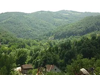 To Šumadija's north are the River Danube and Kosmaj Mountain. To the region's east are the River Morava and the city of Smederevska Palanka. To the south are the Gledić Mountains, with the peaks of Crni Vrh, Kotlenik, and Rudnik southeast, south, and southwest of Šumadija, respectively. West of Šumadija are the Rivers Kolubara, Ljig, and Dičina.[2] According to some interpretations (for example, physiologist J. Cvijić and ethnologist J. Erdeljanović), the northern border of Šumadija lies between the mountains of Avala and Kosmaj.[3] According to that view, Belgrade, the capital of Serbia, does not belong to this region.
