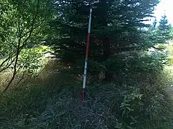 No hiking trail leads to the summit.[3] A ridge main path passes through the summit slope, stretching from the mountain pass towards Lyra peak to the secondary summit of Žárový vrch-SV and on to Plošina peak, marked by two white horizontal stripes.[3][10] The peak is a rocky outcrop, located on a rock group with horizontal dimensions of 76 × 24 m,[15][10] surrounded by spruce forest all around[9] and covered with a very popular plant found almost all over the Hrubý Jeseník, namely European blueberry.[16] The summit rock is a scenic viewpoint from which there are picturesque perspectives towards the peaks of, among others: Praděd, Vysoká hole and Petrovy kameny and the peaks of, among others, the microregion of the Hrubý Jeseník called Keprník Mountains.[17] There is a major triangulation station on the summit slope, marked on geodetic maps with the number 14.[8] The highest point of the mountain has an altitude of 1,100.9 m (3,612 ft) above sea level.[18]