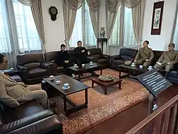 Chiang had always considered a military victory to be preferable to a negotiated settlement, and he pressed ahead with preparations for a sixth encirclement campaign.[49][55] But the tensions between Zhang and Chiang were reaching a breaking point. During Chiang's birthday celebrations on 31 October, Zhang Xueliang attempted to convince Chiang to give up the bandit suppression campaign and focus on Japan instead. Zhang was supported by Yan Xishan and Feng Yuxiang, but Chiang angrily refused. He gave a speech the following day where he proclaimed that "the Communists are our greatest traitors".[56][55][57] When Zhang returned to Xi'an and recounted the incident to Yang Hucheng, the latter suggested reviving the ancient idea of a bingjian (Chinese: 兵谏; pinyin: bīngjiàn; trans. "military remonstrance"). In an episode in Chinese history, a military officer had arrested the Emperor to force him to change a bad policy. The officer had been rewarded for his conduct rather than punished. Zhang, who historian Alexander Pantsov calls a "gallant cavalier", was intrigued by the nobility of the idea.[58][59]
