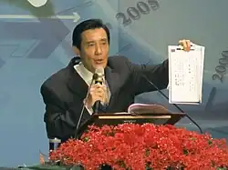 Although he had been considered an ethical and anti-corrupt mayor, Ma was prosecuted beginning in September 2006 on charges of mishandling a US$338,000 special mayoral allowance fund.[69] The corruption case dominated news coverage towards the end of 2006, just as Ma was exiting the mayoralty.[69] The Taipei high court prosecutor's office alleged that he illegally transferred a portion of the funds into his personal account.[70][71] Ma was indicted by the Taipei prosecutor's office on February 12, 2007. On the same day, he announced his candidacy in the 2008 Taiwanese presidential election.[71] In accordance with party rules which prohibit an indicted person from serving as KMT chairman, Ma resigned from the Kuomintang chairmanship despite being encouraged by party members to stay.[72][71] The case ended on August 14, 2007, when Ma was found not guilty and was cleared of all charges by the Taipei District Court, allowing him to enter the presidential race.[d][69][74] Throughout the affair, his popularity remained high as a majority of voters believed the charges to be politically motivated.[75][76]