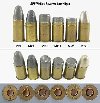 ![]() A variety of .455 Webley cartridges | ||||||||||||||||||||||||