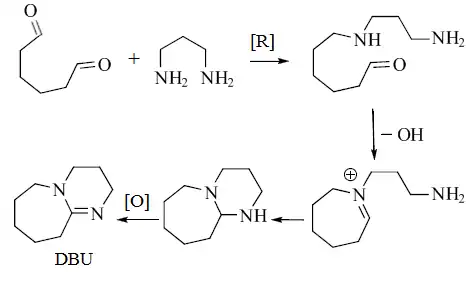 DBU can be synthesised in three steps from caprolactam and acrylonitrile. First, the nitrile undergoes an addition reaction at the caprolactam nitrogen, producing N-(2-cyanoethyl)-caprolactam. This is then hydrogenated to N-aminopropyl-caprolactam, followed by an intramolecular carbonyl condensation to form the imine. Water is removed by fractional distillation.[4]
