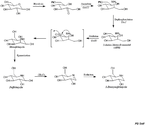 In Bacillus subtilis, D-glucose first undergoes glycolysis, opening the 6-member ring and producing fructose-6-phosphate.[8] GabT1 catalyzes transamination at the C2 position, followed by a dephosphorylation by the Yktc1 enzyme,[7] resulting in 2-amino-2-deoxy-D-mannitol (ADM), an essential precursor.[8] Regio-selective oxidation by GutB1[7] occurs at the exposed C6 hydroxyl of ADM, pushing a C2-N-C6 cyclization of the resulting 6-oxo intermediate,[9] creating manojirimycin (MJ). Epimerization of MJ at the C2 position yields the nojirimycin isomer. Nojirimycin is then dehydrated (loss of -OH at C1 position), along with reduction of the imine moiety.[9] This results in the product 1-DNJ.[8]